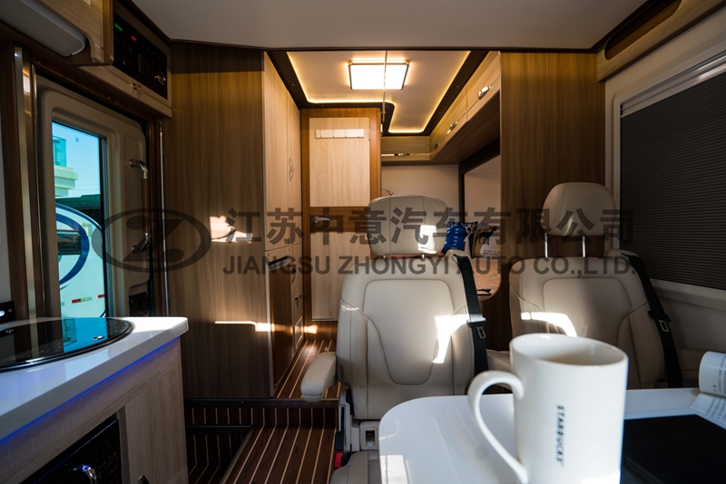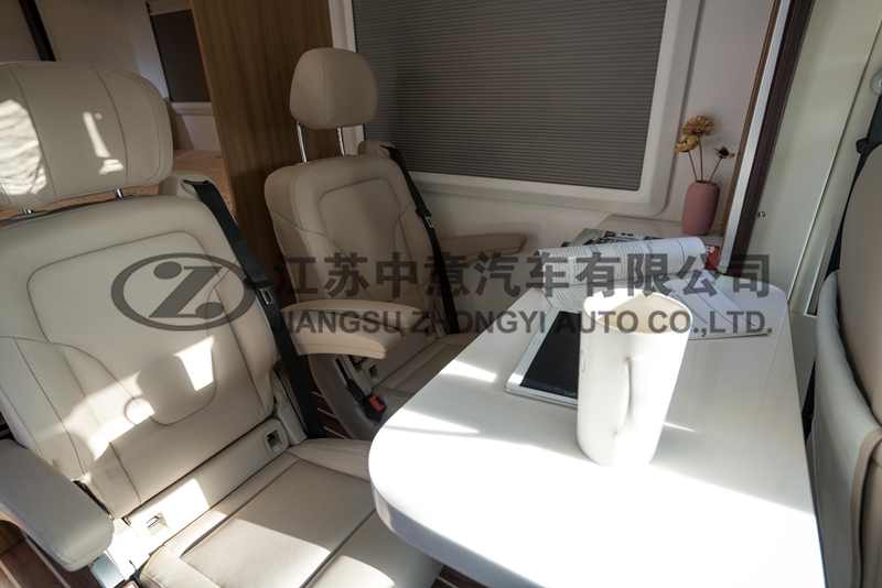 5630彩票网 内饰设计精致素雅,标配的双人卡座沙发,配有安全带,通过配合升降桌的变换,可以形成一张儿童卧床。